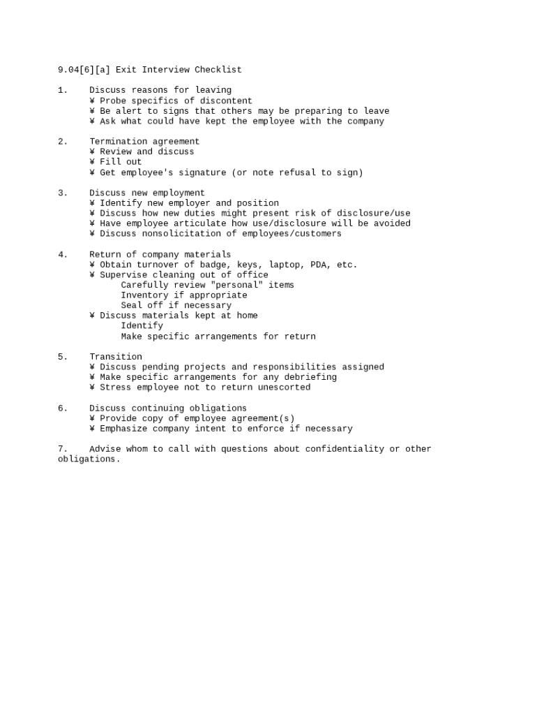 This form is an Exit Interview Checklist used by an employer to discuss important issues with an exiting employee, including termination agreements, return of company materials, ongoing obligations