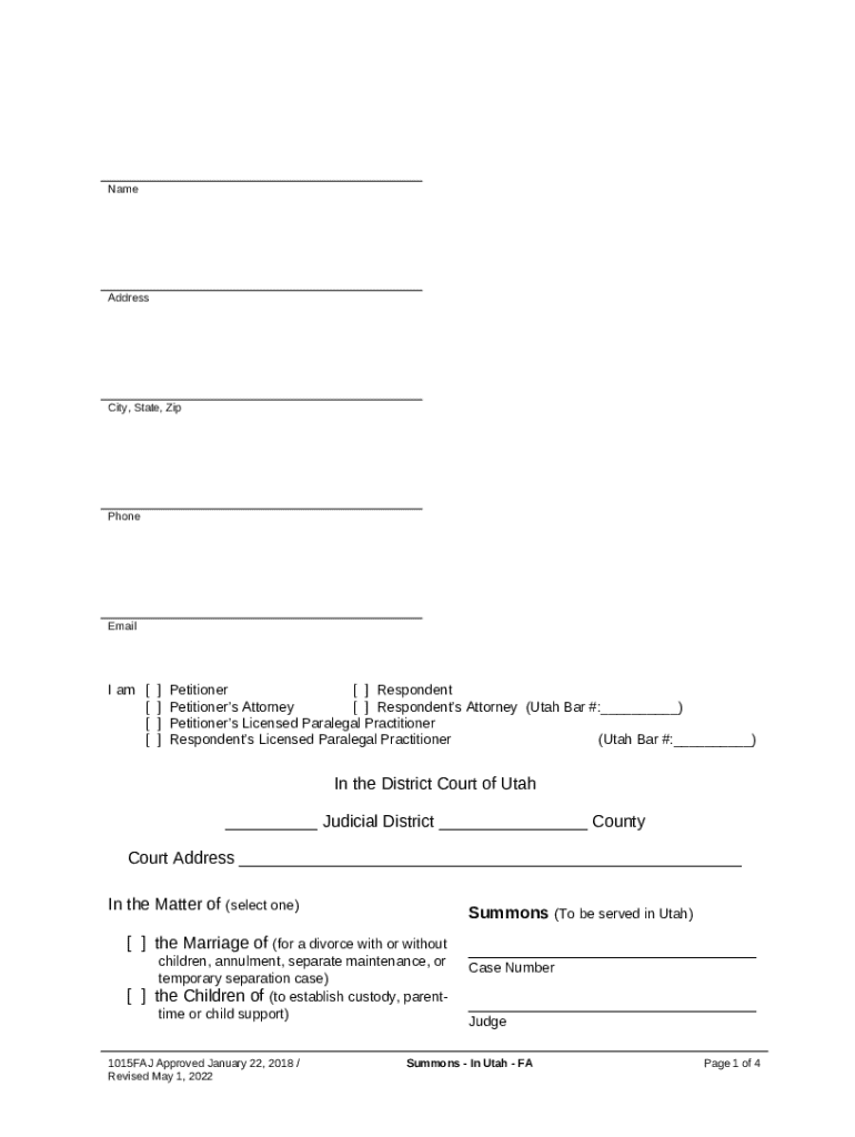 This form, a Summons, is for use in Utah divorce cases. Available in Word or pdf format.