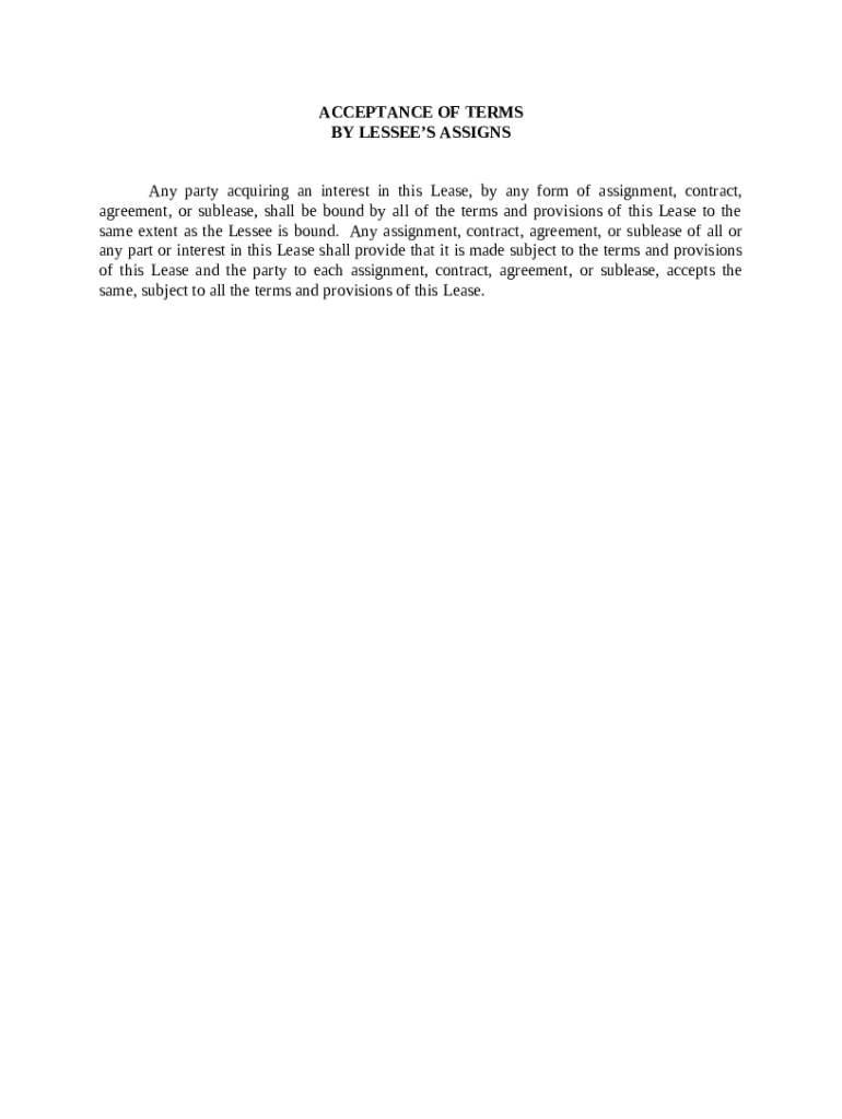 This lease rider form is used when any party acquiring an interest in this Lease, by any form of assignment, contract, agreement, or sublease, accepts and is bound by all of the terms and provisions