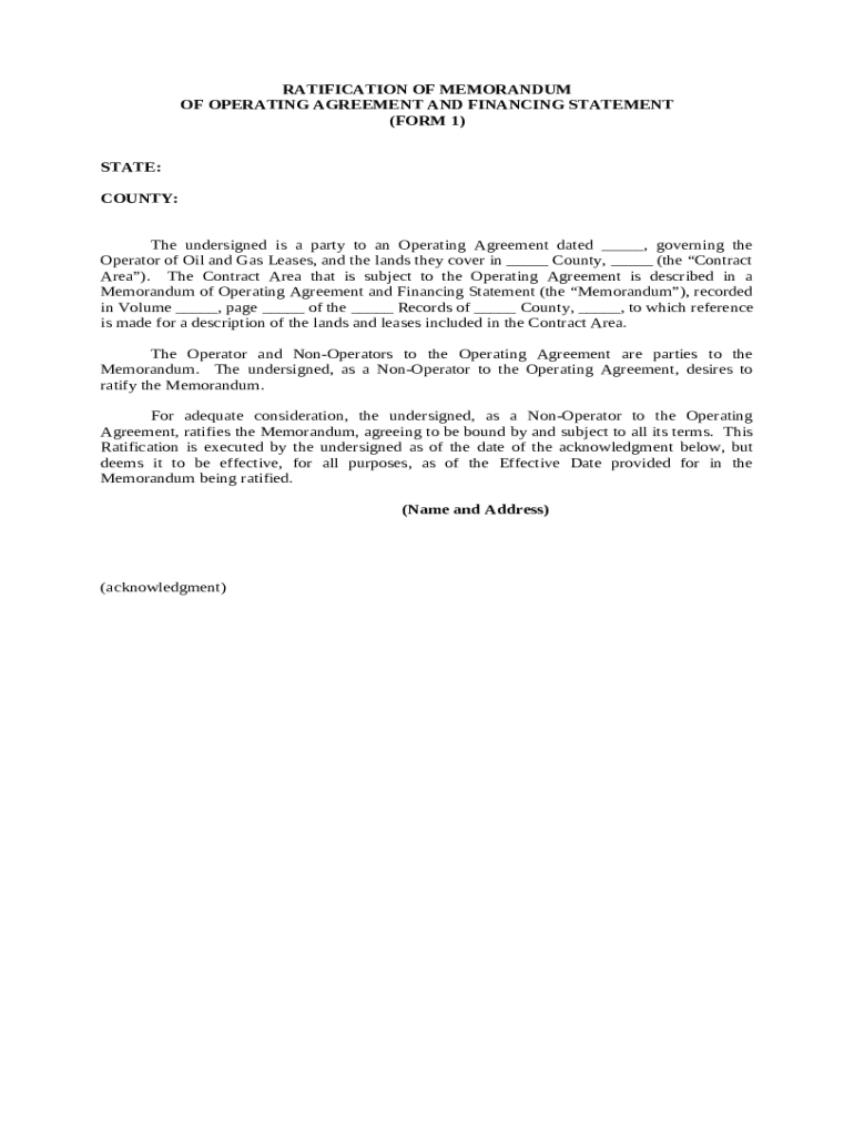 Ratification is the formal approval of an act or agreement, often after the fact. In the context of operating agreements, specifically in the oil and gas industry, it signifies that all parties acknowledge and agree to the stipulations outlined in the memorandum. Operators are typically responsible for managing operations, while non-operators contribute but may have limited control over decision-making.