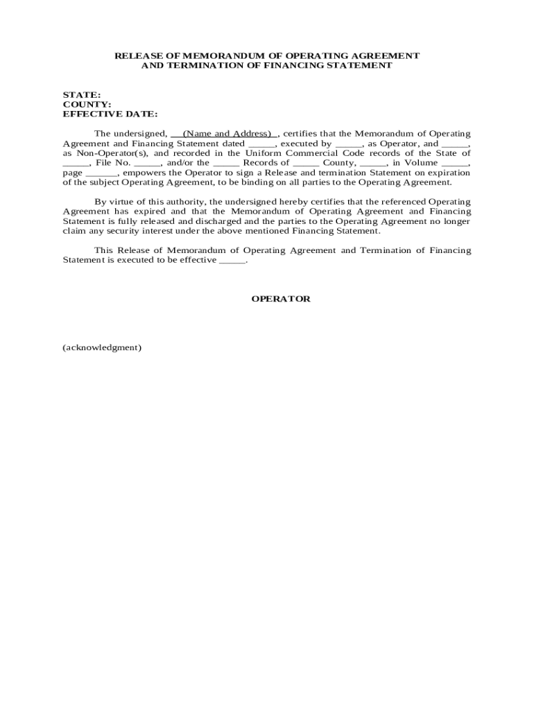 This form is used when the signing party hereby certifies that the referenced Operating Agreement has expired and that the Memorandum of Operating Agreement and Financing Statement is fully released