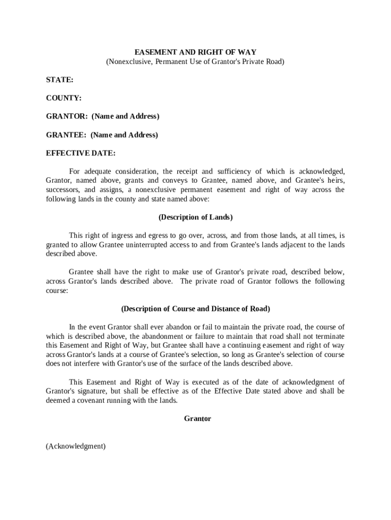 This form is an easement and right of way for nonexclusive, permanent use of grantor's private road.