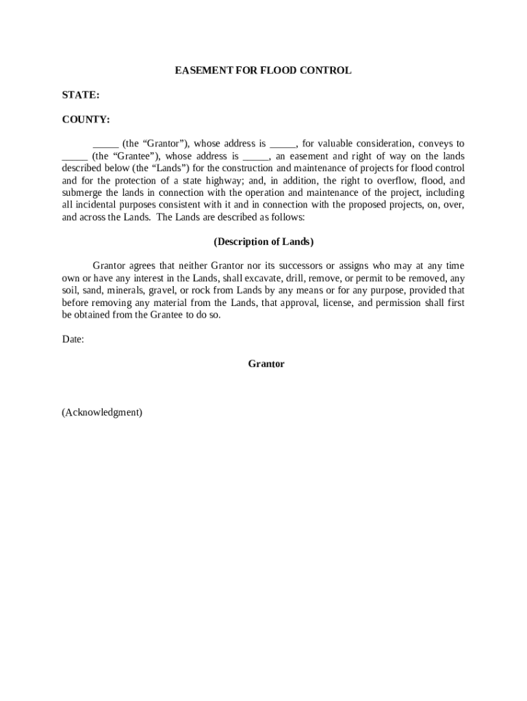 The agreement must clearly define the Grantor (property owner) and Grantee (the entity managing flood control), establishing who holds rights and responsibilities.