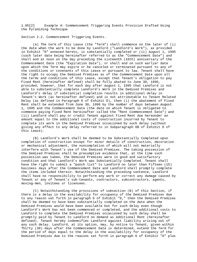 Commencement triggering events are pivotal occurrences outlined in lease agreements and other legal documents that denote when certain obligations begin. They hold substantial importance for both landlords and tenants, setting the timeline for rent payments and occupancy rights.