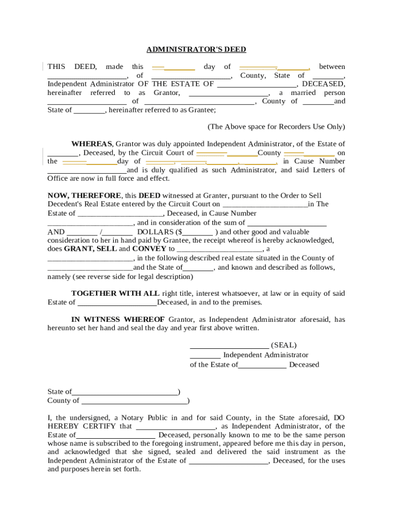 An administrator's deed is a legal document executed by an independent administrator to transfer property from an estate to a designated grantee.