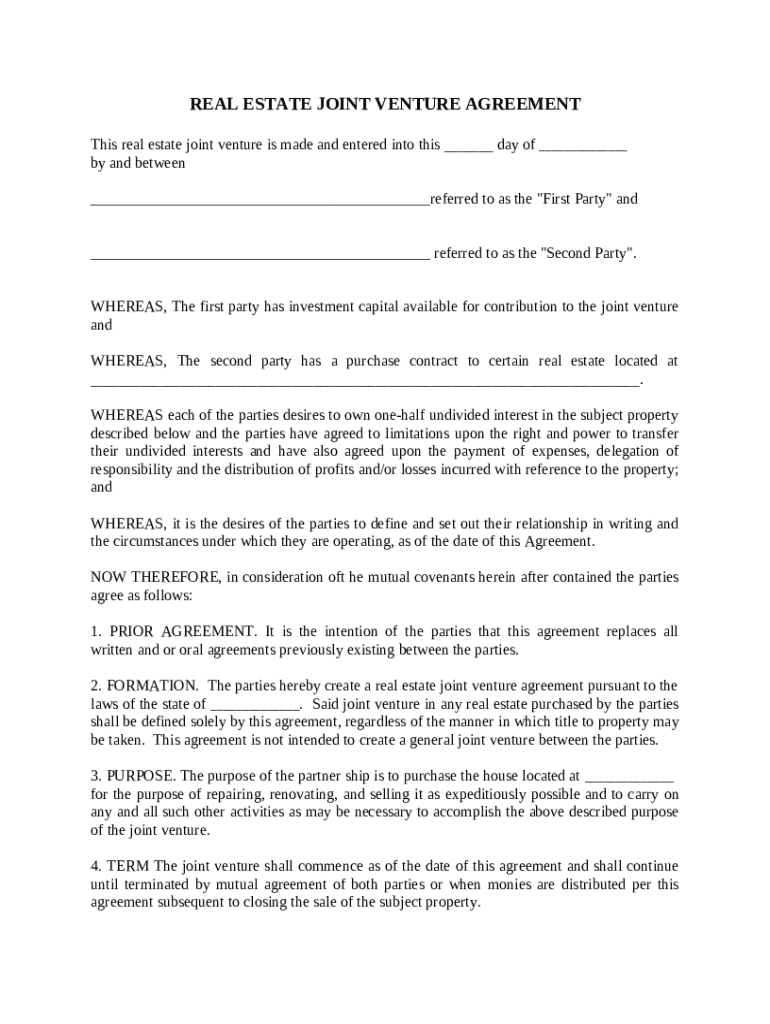 Specify the agreement's goals, such as property purchase or renovation aims, to establish clear expectations.