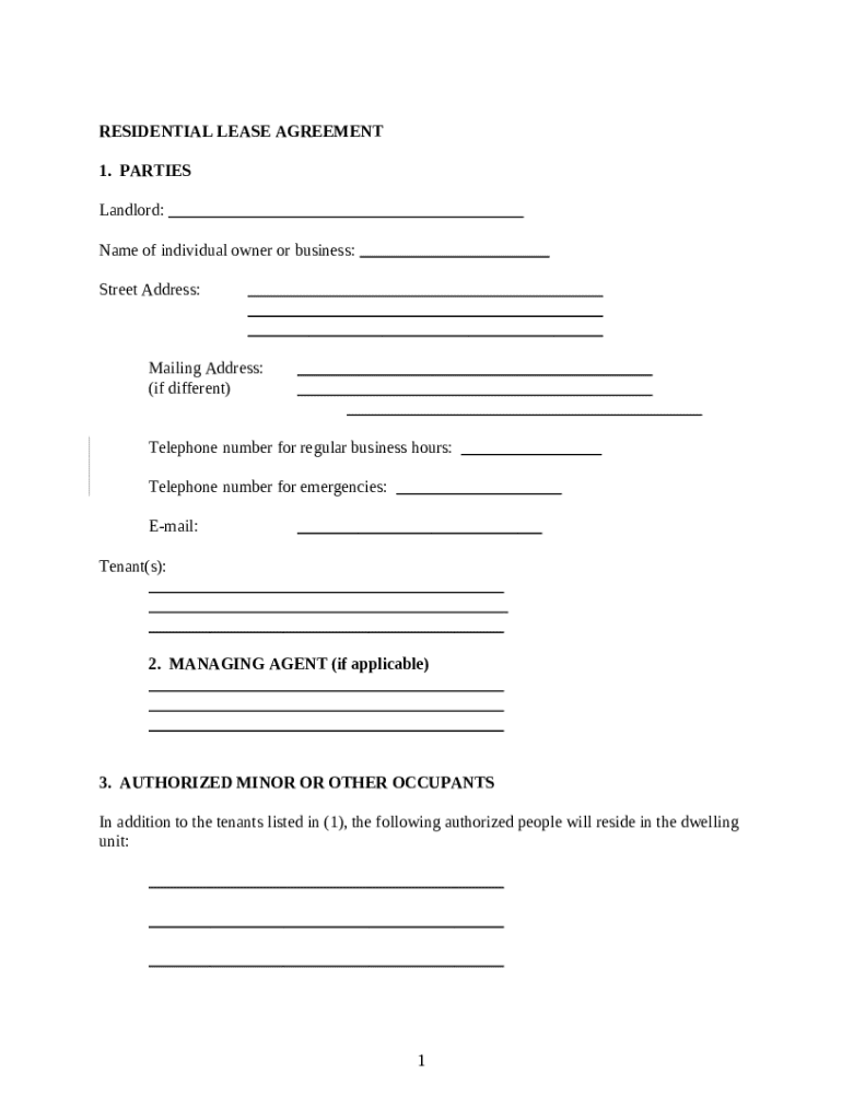 In a residential lease agreement, the primary parties are the landlord and the tenant. Landlords must provide essential information about their identity and contact details while tenants also need to furnish their personal information for correspondence.