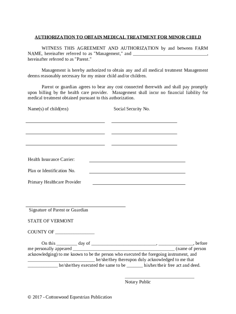 Get the free Authorization To Obtain Medical Treatment For Minor Child - Horse Equine s template