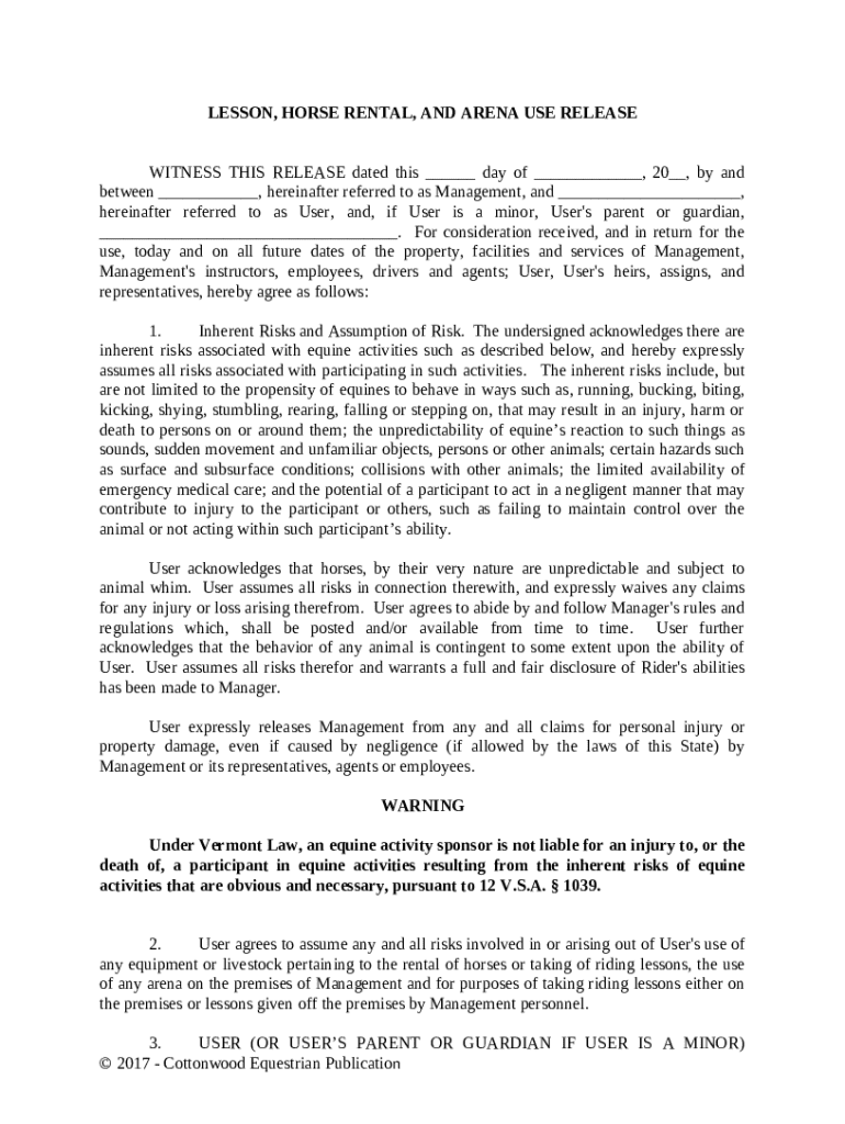 This Lesson, Horse Rental, and Arena Use Release Horse Equine Form is a lesson, horse rental and arena rental release form for a user to sign before being given lessons, or being rented a horse or