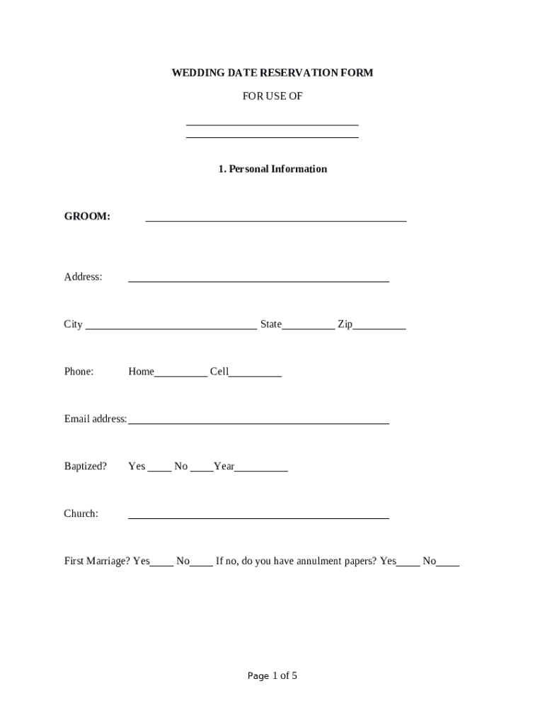 Personal information required on the wedding date reservation form typically includes crucial details about both partners. This information aids in officially documenting the wedding and is necessary for the marriage preparation process.
