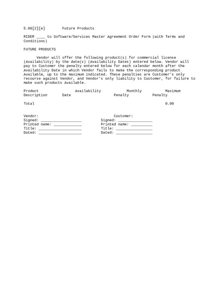 This is a future products rider to the software/services master agreement order form. The vendor agrees to supply the customer with the products named in the rider. If the vendor fails to perform,