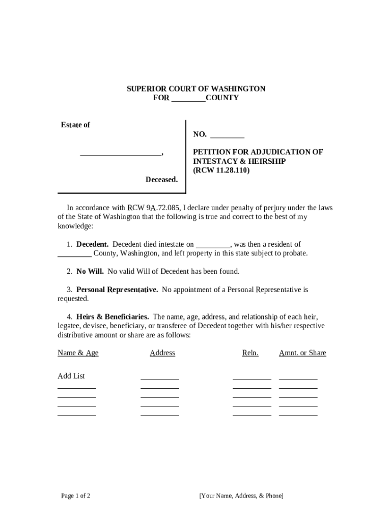 A Petition for Adjudication of Intestacy & Heirship is a crucial legal document that establishes the rightful heirs of a deceased person who did not leave a will. Its significance lies within the framework of intestate succession laws, which govern how property is distributed when someone passes away without a valid will.