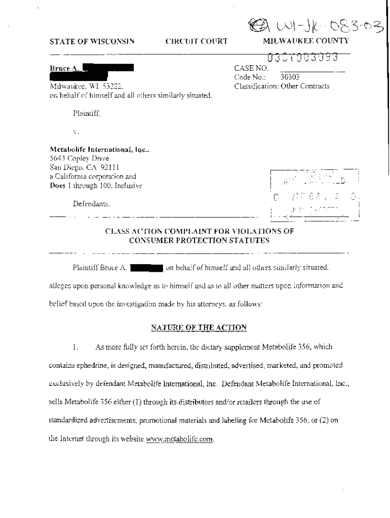 A02 Class Action Complaint For Violations Of Consumer Protection Statutes regarding dietary supplement