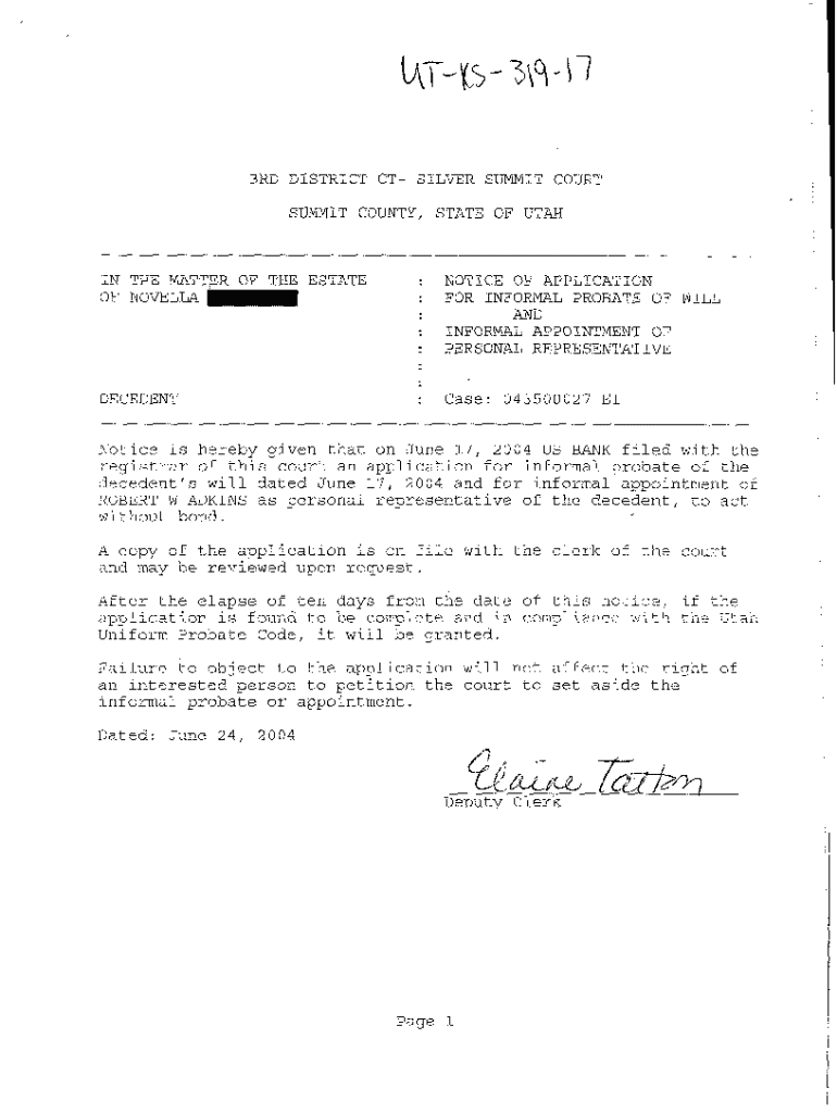 A04 Notice of Application for Informal Probate of Will and Informal Appointment of Personal Representative