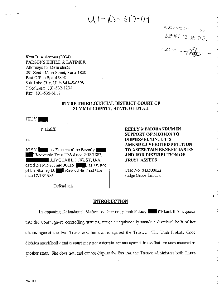 A10 Reply Memorandum In Support of Motion to Dismiss Amended Verified Petition to Ascertain Beneficiaries and Distribution of Trust Assets