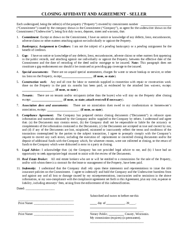 A closing affidavit and agreement is a legal document used by sellers in real estate transactions. Its purpose is to disclose relevant information about the property, affirm the seller's declarations, and confirm that no liens or encumbrances exist against the property.