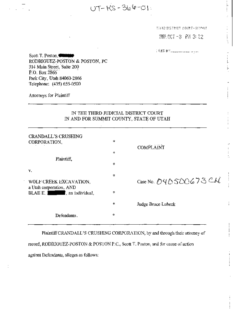 A01 Complaint - Breach of Contract for Sale of Gravel, of Personal Guarantee, and of Covenant of Good Faith and Fair Dealing