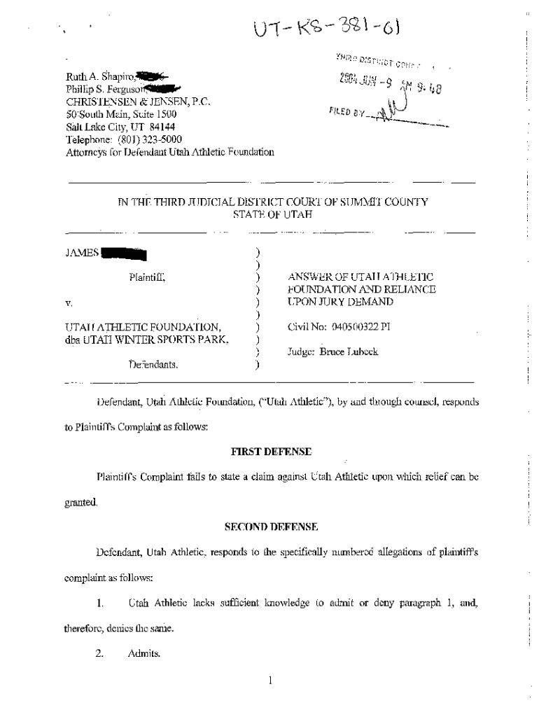 A01 Answer of Utah Athletic Foundation and Reliance Upon Jury Demand