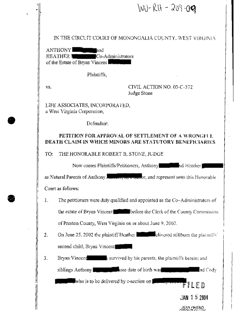Get the free A09 Petition for Approval of Settlement of Wrongful Death Claim in Which Minors are ...