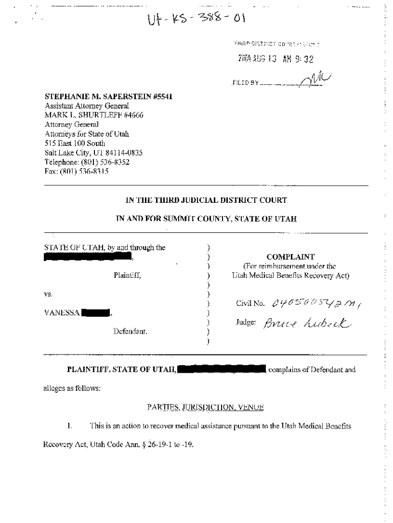 Get the free A01 Complaint For Reimbursement under the Utah Medical Benefits Recovery Act
