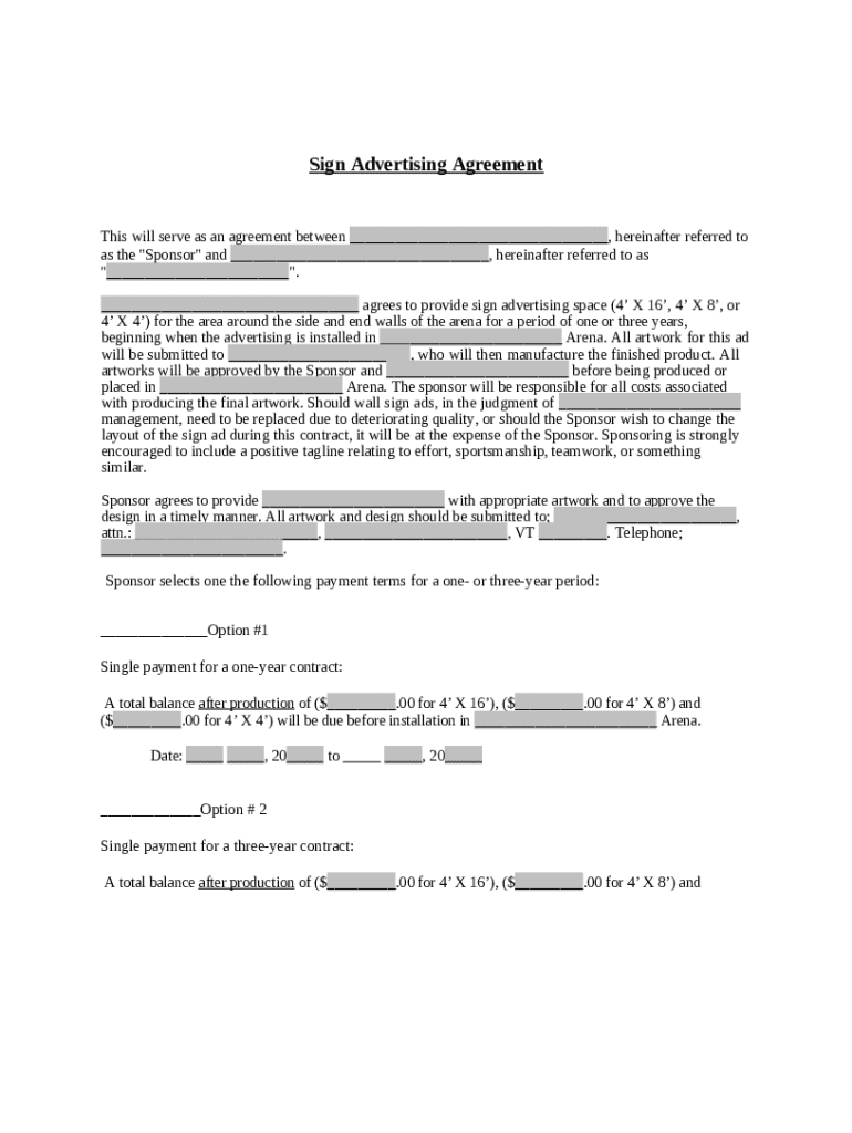 A sign advertising agreement is a legal document that outlines the terms and conditions for displaying advertisements on a signboard or similar structure.