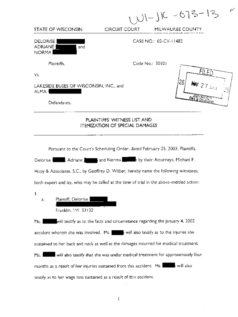 A05 Plaintiffs' Witness List And Itemization Of Special Damages