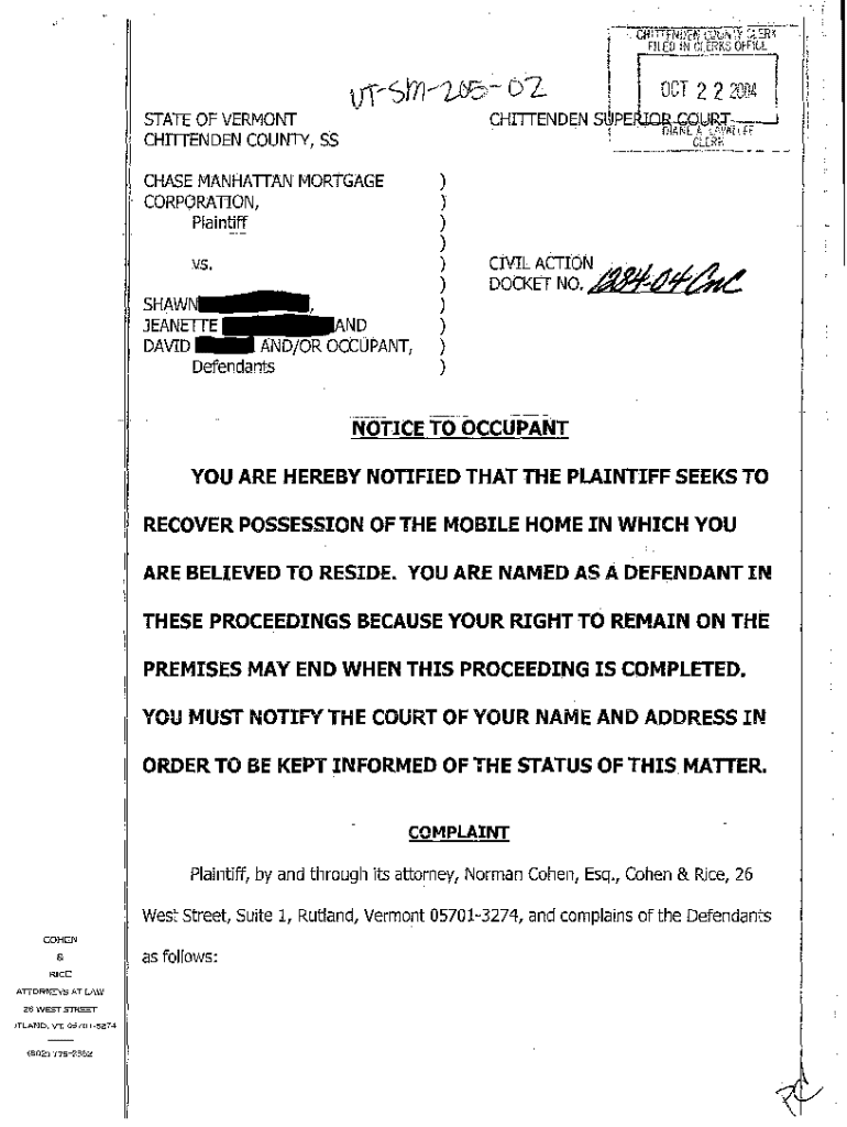 Get the free A01 Notice of Occupant and Complaint for Possession of Mobile Home