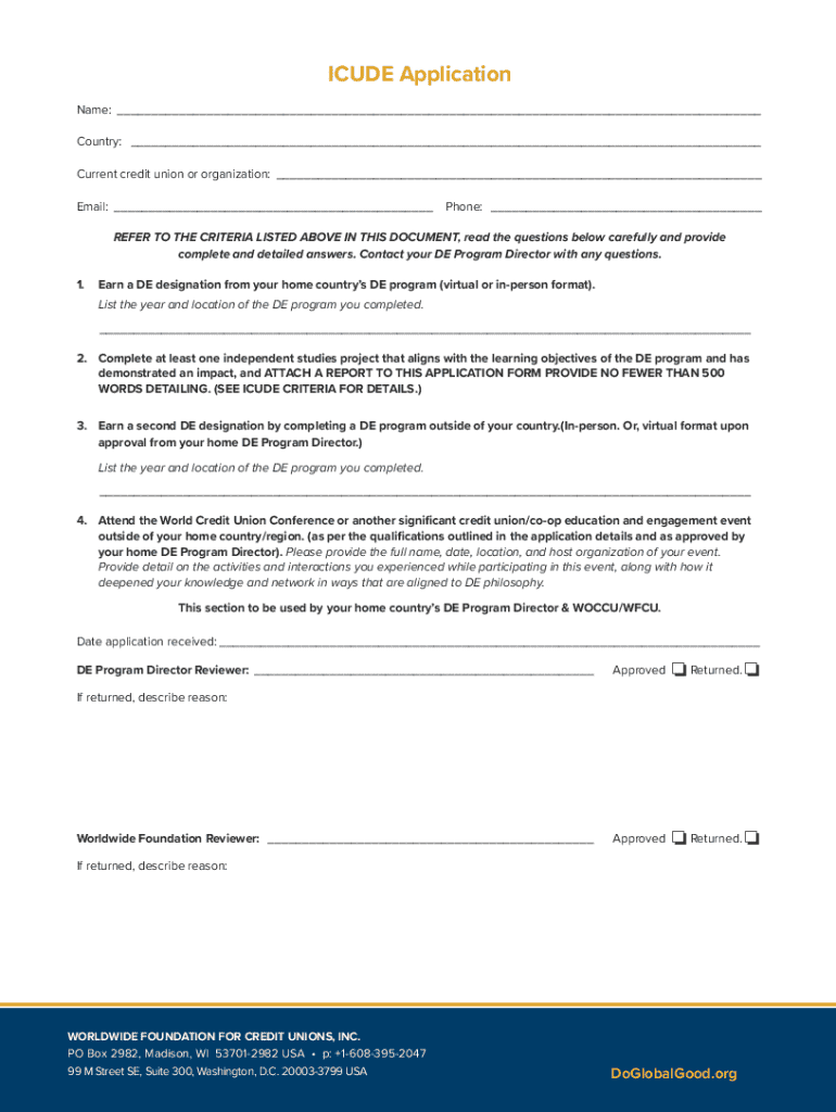 This document serves as the application form for the International Credit Union Development Educator (ICUDE) designation for 2025. It contains information on the criteria required for application,