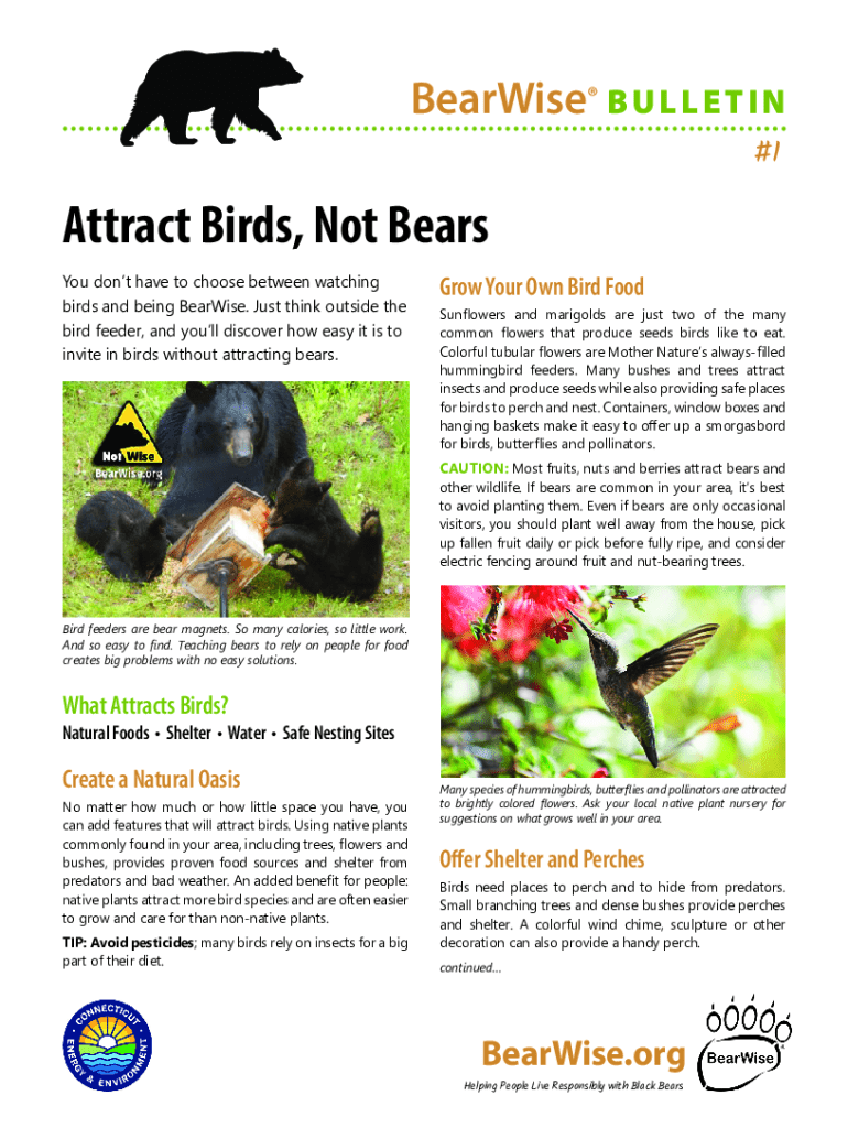 This bulletin provides guidance on how to attract birds to your garden while minimizing the risk of attracting bears. It discusses various plants, habitats, and features that can create a bird-friendly