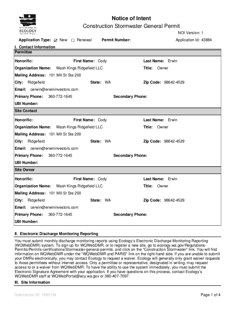 This document serves as a Notice of Intent (NOI) for obtaining a Construction Stormwater General Permit. It includes sections detailing contact information, site information, stormwater pollution