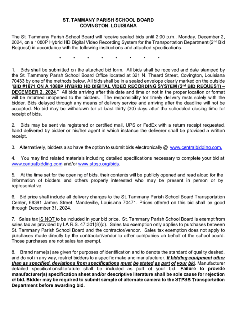 ST. TAMMANY PARISH SCHOOL BOARD COVINGTON, LOUISIANA The St. Tammany Parish School Board will receive sealed bids until 2:00 p.m., Monday, December 2, 2024, on a 1080P Hybrid HD Digital Video Recording