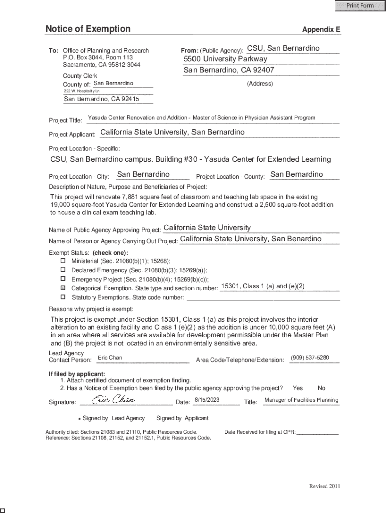 This form serves to inform the Office of Planning and Research about an exempt project pertaining to the renovation and addition of classroom and teaching lab space at CSU, San Bernardino.