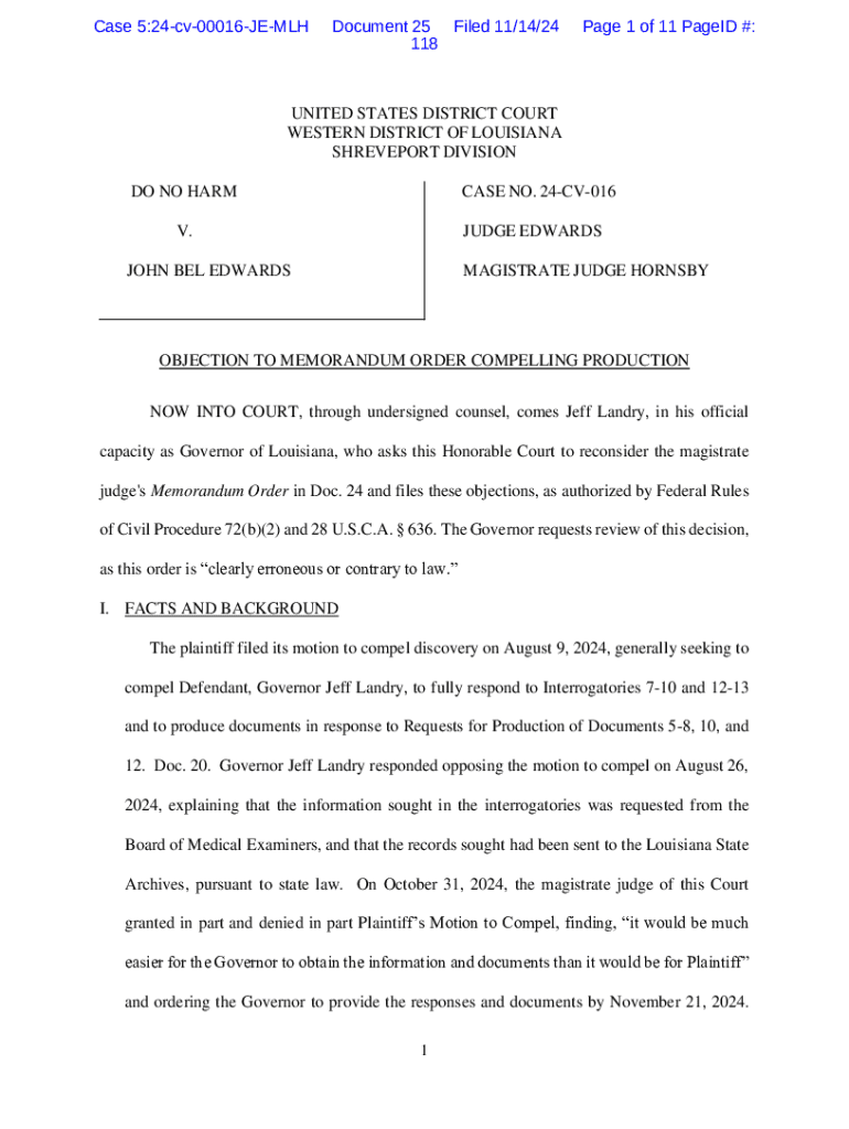In this document, Governor Jeff Landry files objections to the magistrate judge\'s Memorandum Order compelling production of documents regarding a motion to compel in the case against him. The document