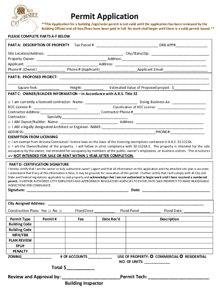 This document provides instructions and requirements for applying for a building permit in the City of Bisbee. It outlines that an application does not equate to a valid permit until all processes,
