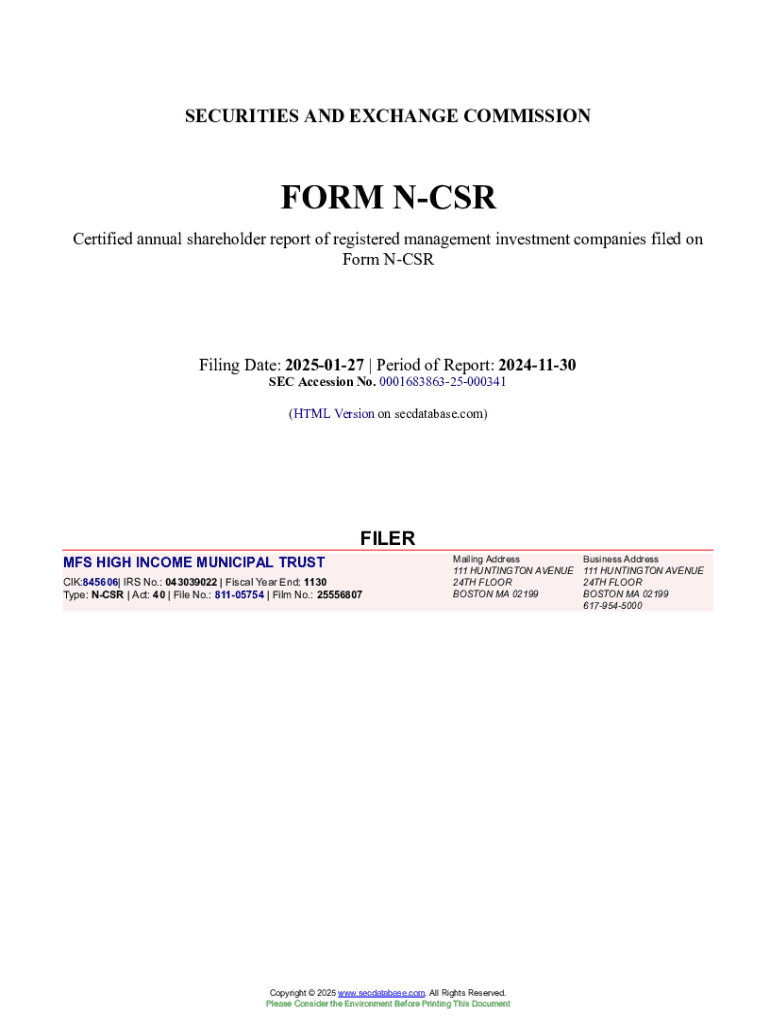 This document is a certified annual shareholder report filed by MFS High Income Municipal Trust, detailing the financial performance, portfolio composition, and management review for the period ending