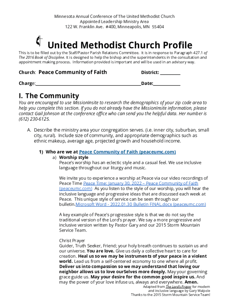 The United Methodist Church profile is a document that provides essential information about a local church's identity, membership, programs, and leadership.