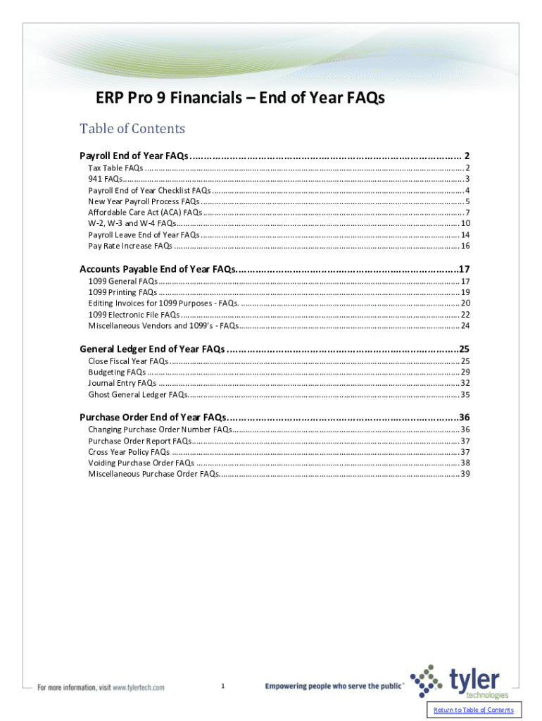 ERP Pro 9 Financials End of Year FAQs Table of Contents Payroll End of Year FAQs ............................................................................................... 2 Tax Table FAQs ...............................................................................................................................................