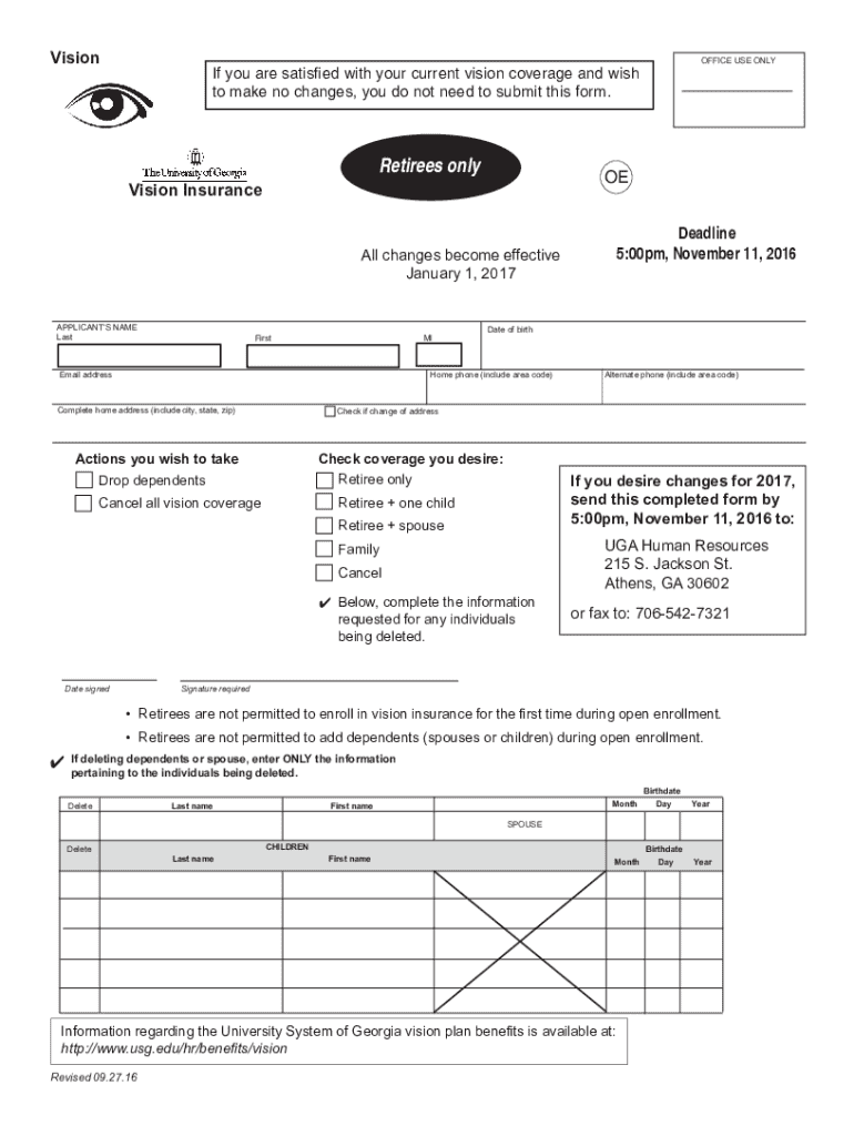 VisionOFFICE USE ONLYIf you are satisfied with your current vision coverage and wish to make no changes, you do not need to submit this form.Retirees onlyOEVision InsuranceDeadline 5:00pm, November