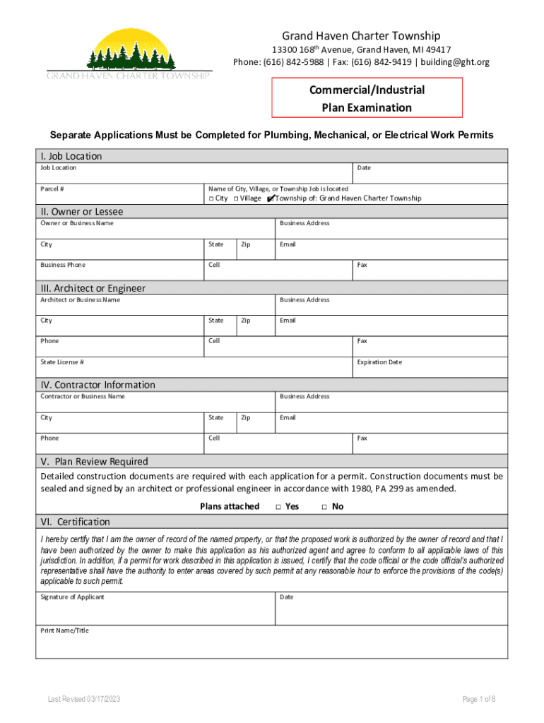 This document is an application for obtaining a Commercial/Industrial Building Permit for projects within Grand Haven Charter Township. It outlines the necessary information regarding job location,