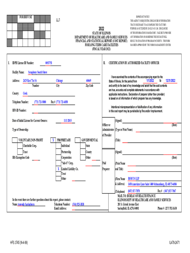 This document is a financial and statistical report for long-term care facilities in Illinois for the fiscal year 2022, detailing income, expenditures, and statistical data related to operations.