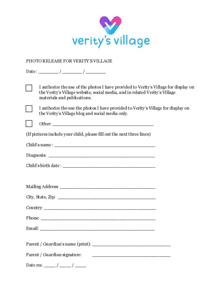 This document serves as a photo release authorization for the use of images provided to Verity\'s Village for various promotional purposes including their website, social media, and publications.