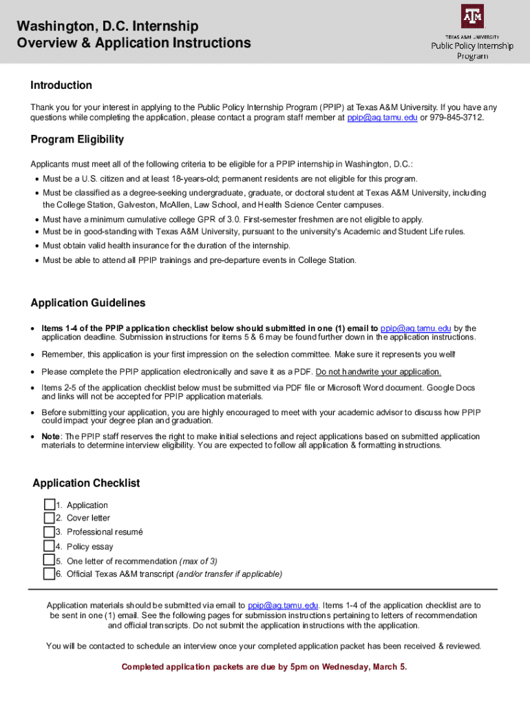 Application instructions and guidelines for the Public Policy Internship Program at Texas A&M University, detailing eligibility criteria, required documents, and submission processes for interested