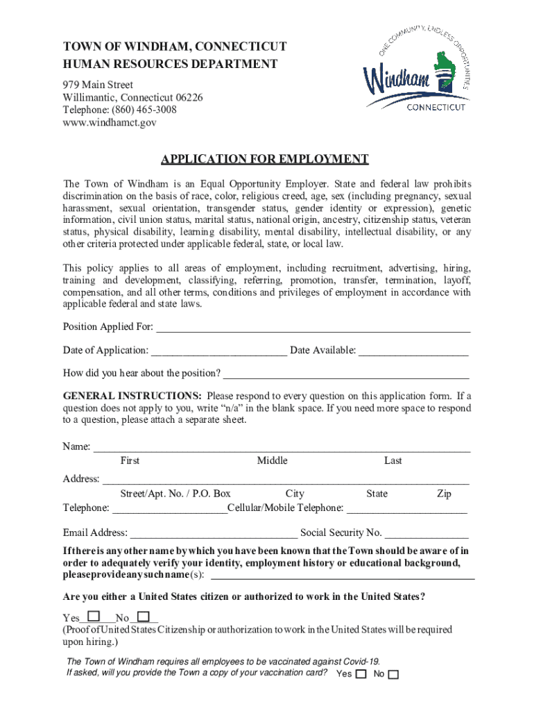 This document serves as an application for employment at the Town of Windham, Connecticut, outlining the equal opportunity employment policy, personal information sections, employment history requirements,