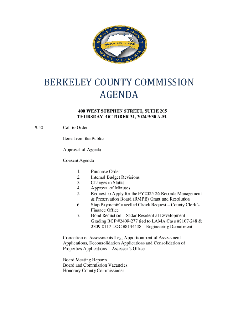 This document outlines the agenda for the Berkeley County Commission meeting scheduled on October 31, 2024. It includes items to be discussed, approvals required, updates from various departments,