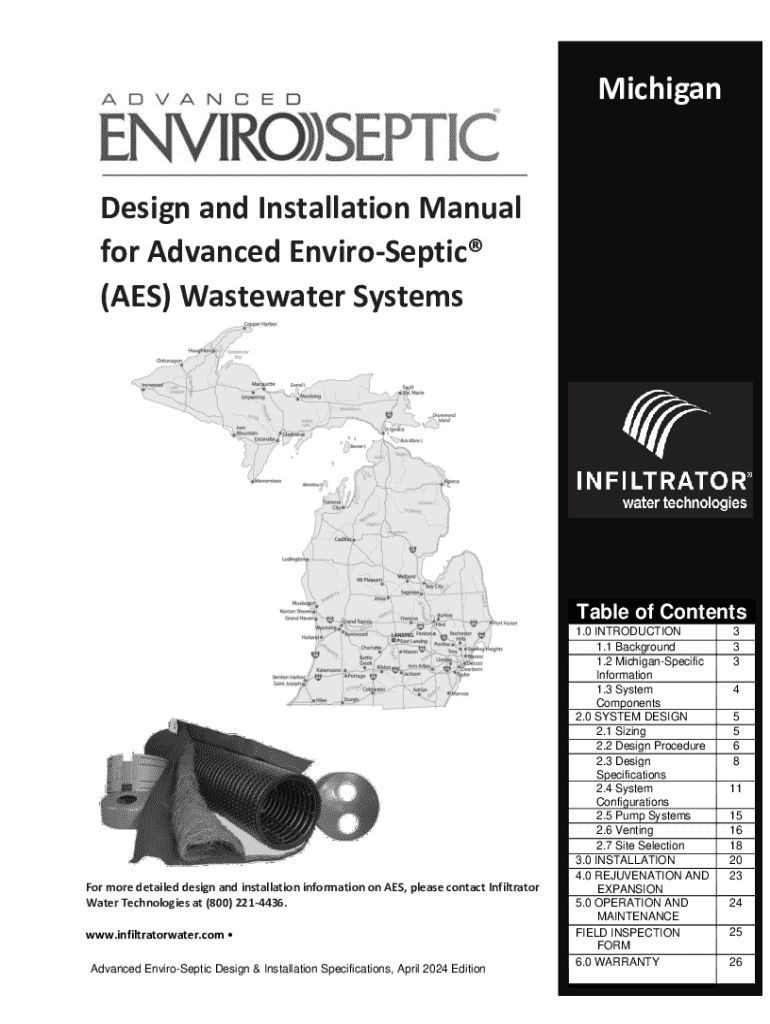 El manual proporciona las especificaciones mínimas para el diseño e instalación del sistema de tratamiento de aguas residuales Advanced Enviro-Septic (AES) en Michigan, dirigido a diseñadores,