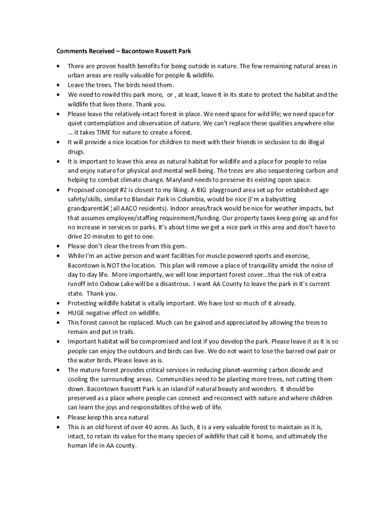 Comments Received Bacontown Russett Park There are proven health benefits for being outside in nature. The few remaining natural areas in urban areas are really valuable for people & wildlife. Leave