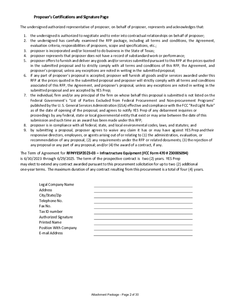 Este documento debe ser completado y firmado por un representante autorizado de un proveedor y contiene formularios requeridos para la propuesta de RFP de YES Prep. Incluye certificaciones, declaraciones