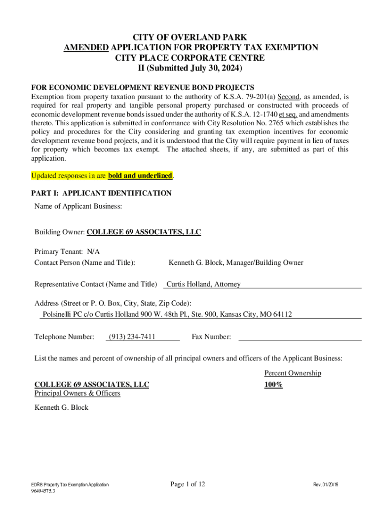 This document serves as an application for property tax exemption related to economic development revenue bond projects in Overland Park, Kansas. It outlines the requirements and details necessary