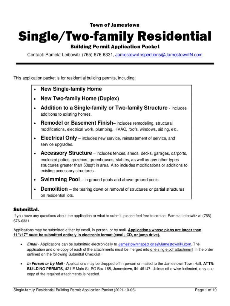 This application packet is for obtaining building permits for residential structures in Jamestown, including new homes, additions, remodels, pools, demolitions, and accessory structures. It outlines