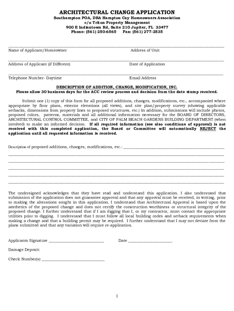 This application form is used by the Southampton POA, DBA Hampton Cay Homeowners Association, for applicants to submit requests for additions, changes, or modifications to their property. It details